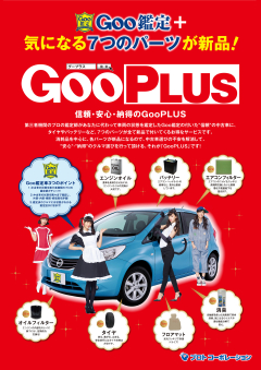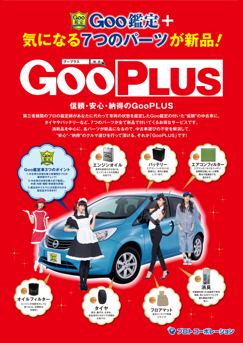 谷 健司)は、2014年10月1日より中古車選びの新基準として、新サービス「Goo PLUS(グープラス)」の全国展開を開始致しました。 「GooPLUS」とは第三者機関のプロの鑑定師が鑑定を実施し、車両の状態情報 の開示がされた「Goo鑑定(グーカンテイ)」付中古車に、7種類の消耗品等を新 品に交換・取り付けを行うサービスです。 クルマ情報誌「Goo(グー)」、クルマ・ポータルサイト「Goo-net(グーネット)」 等のメディアと、全国の中古車販売店で「GooPLUS」をブランド(特選車)展開 することにより、ユーザーの中古車選びに更なる「信頼・安心・納得」の提供 を目的としてサービスの拡大を図って参ります。 今後とも株式会社プロトコーポレーションは、ユーザーにとって納得できる中 古車選びが行える機会を提供することで、自動車業界の更なる活性化に取り組 んで参ります。 【GooPLUSの特長】 (1) Goo鑑定+気になる7つのパーツが新品 車輌の状態情報の開示がされた「Goo鑑定」付中古車に、7種類の消耗品等(タ イヤ、フロアマット、バッテリー、オイルフィルター、エンジンオイル、エア コンフィルター、消臭剤での消臭作業)を新品に交換・取り付けを行います。 (2) 分かりやすい情報提供 クルマ情報誌「Goo」、クルマ・ポータルサイト「Goo-net」等のメディアにお いて、「GooPLUS」車を容易に検索できるコンテンツ提供を行って参ります。 (3) 全国の「GooPLUS」取扱店で車両を展示 中古車購入を検討されているユーザーが実際に車両を確認できる様に、全国の 「GooPLUS」取扱店で、「GooPLUS」車両を展示致します。