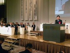 大会は、九州トラック協会の原重則会長の歓迎の言葉と「トラック業界は結束が弱い。バラバラにされたら要望が通らない。最後は結束だ」の団結を呼びかける開会の挨拶で始まった。 星野会長は「全国から1500人以上の会員を迎え心から歓迎します。昨日は『トラックの森づくり』植樹式が飯塚市で行われ、環境保全に貢献したいと考えております」と述べたあと、広島市内の土砂災害での広島県トラック協会の対応に祝辞を述べて、近年の自然災害の頻発に関して「7月末に施工した全日本トラック総合会館は大規模災害時に中央の司令塔としてその機能を発揮したい」と述べた。また最近の経済成長率下落と燃料の価格上昇について「7月インタンク126円超の2008年秋以来の高値。こうした状態が続けば、我が国の経済活動と国民生活を支えるトラック事業者は、事業存廃の危機に直面に、輸送力の確保が困難となる。燃料対策の緊急要望、併せて全国一斉の署名活動を実施、皆様の努力で目標の倍の200万余の署名を集めることが出来た。今後は、私が先頭に立って、経由引取税の旧暫定税率の廃止等、燃料高騰対策の早急な実施を政府与党に強く訴えています。業界の明るい未来を自らの手で切り開くため、叡知と総力を結集し、頑張ってまいりたい」と強い決意を述べ挨拶した。 大会は「トラックの交通安全対策の推進について」と「トラック業界の人材確保など育成について」をテーマに分科会が開かれた後、大会再開となった。 来賓祝辞で、小川洋・福岡県知事は「トラックは輸送の9割を担い経済活動の大動脈ですが、コスト上昇で経営は大変厳しいものがあります。県としては経営刷新をはじめ金融支援など総合的に積極的な支援をしており、今後も応援したい」と祝辞。 また、田端浩・国土交通省自動車局長は「燃料高騰でトラック事業の経営は大変厳しいと承っております。どんな対策をとるかそれに資する予算措置等とりくみは多々あり、ご協力をお願いしたい。また労働力不足も重要です。我が国の物流を支えるトラック産業の今後を見据えた重要な施策を万進して参りたい」と述べた後、太田昭宏・国土交通大臣の「トラック事業者の負担軽減に向け全力で取り組んでまいります」との祝辞を代読した。 軽油引取税の旧暫定税率の撤廃など8項目の大会決議と各都道府県別の車両1万台当たり死亡事故件数を「2.0」とする事故防止の徹底に係る大会決議を満場一致で採択して大会は閉会した。