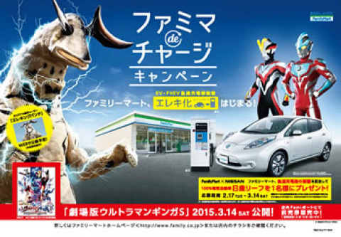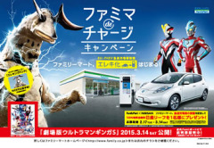 日産自動車は、トヨタ自動車株式会社、本田技研工業株式会社、三菱自動車工業株式会社の3社と大同団結し、電動車両(EV・PHEV)の普及に向け、充電器の設置促進活動を行っています。 またファミリーマートは、地域と一体となって低炭素化社会の実現に貢献することを目的に、急速充電器の設置促進をしており、2015年3月末までに設置店を約650店舗まで拡大する見込みです。 これにより、充電中の休憩や買い物など、EVユーザーにとって飛躍的に利便性が向上することが期待されています。 より多くのユーザーに「電気自動車」や「急速充電器」を身近に感じてもらうために、「ファミマ deチャージ キャンペーン」を、全国のファミリーマート店舗約11,300店で実施しています。 今回のキャンペーンでは、100%電気自動車「日産リーフ」のプレゼントや「日産リーフ」も劇中活躍する「劇場版ウルトラマンギンガS」の公開を記念した限定グッズのプレゼントもする。 キャンペーン詳細は下記のサイトから http://www.family.co.jp/campaign/charge/