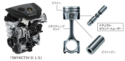 マツダがディーゼルノック音の発生メカニズムを探究した結果、燃焼時にコネクティングロッドの伸縮にともない発生するピストンの振動が原因であると判明しました。このたび新開発した「ナチュラル・サウンド・スムーザー」は、空洞のピストンピンに内蔵することでノック音の原因である振動を吸収する技術です。 これにより、特に発進時やゆっくりとした加速時などに車室内で聞こえやすい周波数3.5kHz付近のディーゼルノック音を、未装着車に比べて最大で10dB低減※2しました。 ※1 「ナチュラル・サウンド・スムーザー」は、日本市場の「CX-3」の一部の機種にオプション設定。 ※2 マツダ調べ