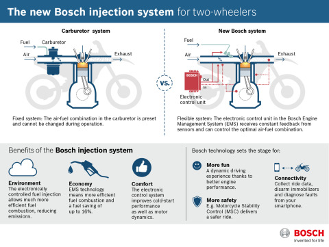 ボッシュは、 二輪車向けに新しい電子式エンジン制御システムを設計しました。 このシステムには、 燃料の噴射と供給、 エアマネジメント、 点火、 排出ガス後処理を担うコンポーネントのほか、 エレクトロニック コントロール ユニットも含まれています。