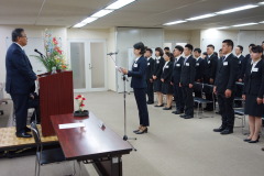 深井義博社長が「みなさんには、一日も早く戦力になって頂き、積極果敢に変革への挑戦を体言していただきたい。戦力になる為には現場主義の実践です。当社は社員全員が自ら汗を流して実作業を行い、その中で様々な価値を見出し、利益を上げているのです。社員は物流パーソンでなければなりません。また、信頼される人になることも大切であります。最後に健康であることは社会人の基本です。各自が健康管理を実践するようにお願いします」と訓示した。 新入社員を代表して池田恵さんが「物流のプロフェッショナルとなるべく、全身全霊をもって業務に取り組む決意を新たにしています。また、現在の事業環境や世界経済のお話を伺い世界を相手に戦うことの厳しさを知ると同時に、大きな舞台で活躍できる自分たちの未来へ心を弾ませています。現場主義を実践できる社員となり、企業価値の向上と豊かな社会の実現に貢献できるよう日々精進してまいります」と決意を述べた。