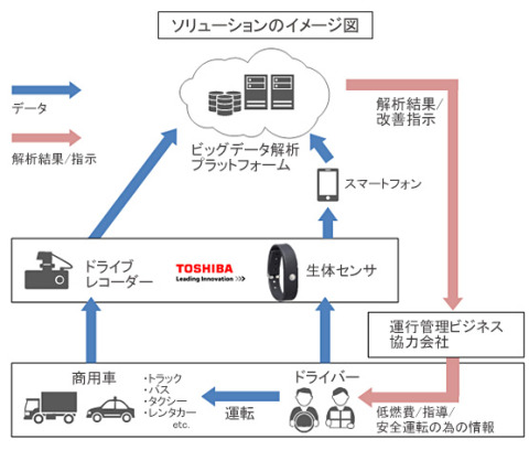 東芝と日本アイ・ビー・エム(以下、日本IBM)は、両社の技術・知見を融合させ、ドライブレコーダーやGPS等の従来情報にドライバーの生体情報を加え、安心・安全・省エネルギーを実現する自動車運行管理ソリューション分野で協力していきます。5月14日発表しました。東芝は、2015年中に欧州等での実証実験を開始する予定で、将来的には運送会社・タクシー会社・保険会社など幅広い企業へのサービス提供を目指します。