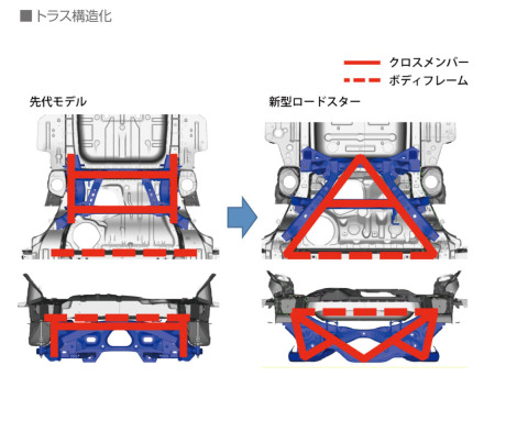 新型「ロードスター」は、「SKYACTIV(スカイアクティブ)技術」*1とデザインテーマ「魂動(こどう)-Soul of Motion」を採用した新世代商品の第6弾となるモデルです。人がクルマを楽しむ感覚の深化に徹底的に取組み、「人馬一体」の楽しさを追究した、後輪駆動(FR)の2シーターライトウェイトオープンスポーツカーです。 誰もが一瞬で心ときめくデザインを目指して、短く低いフロントオーバーハングと、人を中心に配置したコンパクトなキャビンとでつくり出した、乗る人の姿が引き立つプロポーションと、路面に張りつくような安定感と敏捷さをイメージさせる、低くワイドな台形フォルムを実現したとしています。ボディパネルがドアトリム上部まで回り込んで、クルマの内と外の境界を感じさせない、開放感のあるインテリアデザインとのことです。 見晴らしがよく、周囲の状況や車の挙動を掴みやすい視界を実現したとしています。新開発のネット素材とウレタンパッドを組み合わせることで、着座した瞬間に体を包み込み、走行中のホールド性を大幅に向上させた新構造「S-fit構造」シートを採用しています。新開発の直噴1.5Lガソリンエンジン「SKYACTIV-G 1.5」をフロントミッドシップに搭載し、前後重量配分を50:50としています。6速直結とし、構造をシンプル化・小型化して軽量化を図った、新開発のFR用の6速マニュアルトランスミッション「SKYACTIV-MT」では、軽い操作感、シフト操作中の吸い込み感、節度感を実現したとのことです。6速オートマチックトランスミッションでは、スリップ・ロックアップ領域の拡大によるダイレクト感の向上とともに、ブリッピング機能*3やドライブセレクション*4の追加などスポーティで力強い走りを実現しています。マツダ初のデュアルピニオンタイプの電動パワーステアリングシステムを採用し、剛性感の高い操舵特性と路面からのダイレクトなフィードバックを実現そうです。 ボディには、アルミや高張力鋼板、超高張力鋼板の使用比率を71%に高め(前モデル58%)、さらに剛性を確保しながら軽量な構造を追求するなどして、先代モデル比100kg以上*2となる大幅な軽量化(車両重量990kg〜1,060kg)を実現しています。 コックピットは、優れた視界、操作性の優れた機器配置、ドライバーに対して正対するペダルレイアウトなど、スポーツカーとして理想的なドライビングポジションを実現しています。 幌は、軽い操作で簡単に開閉でき、耐候性にも優れた構造を採用。使い勝手の良さを考えた室内小物入れや脱着式ドリンクホルダー、飛行機内に持ち込み可能なサイズのキャリーバッグを2つ積めるトランクなど、2シーターのスポーツカーでありながら、利便性が高く、毎日の生活に新鮮な刺激をもたらす車であることにこだわりました。 マツダの小飼雅道社長兼CEOは、新型ロードスターの発売に際し、次のように述べています。「1989年に発売した『ユーノスロードスター(初代ロードスター)』には、現在、マツダブランドの象徴となっている『人馬一体』の走る楽しさがあり、オープン走行の爽快さ、手頃な価格などを含めて高く評価され、四半世紀を越えて愛されてきました。初代ロードスターの当時のカタログには『だれもが、しあわせになる。』というメッセージがあり、これは、ロードスターのみならず、マツダブランドの進むべき方向を言い当てていたと強く感じています。現在、マツダは、お客様とのさまざまな接点で、お客様の人生をより豊かにし、ずっと寄り添い、走る歓びと笑顔をお届けすることで、お客様との間に特別な絆を持ち、選ばれ続けるオンリーワンのブランドになることを目指しています。新型ロードスターを通して、さらに多くのお客様に走る歓びと笑顔をお届けし、マツダのさらなるブランド価値向上につなげていきます」。 ○メーカー希望小売価格 2,494,800円〜(消費税込み) ○販売計画台数 500台/月
