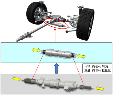 NTNによると「自動車の後輪転舵は、高速走行時における車両安定や、中・低速走行時のコーナリング性能を向上させる機構で、後輪転舵の駆動には、電動アクチュエータが用いられます。1つのアクチュエータで転舵する『左右一体型』は左右トー角独立制御の機能がなく、左右それぞれにアクチュエータを配置して転舵を行う『左右独立型』は、ばね下重量の増加による走行性能の低下が課題」とのことでした。 NTNの「後輪独立転舵システム」は、左右一体型でありながら左右トー角独立制御が可能で、アクチュエータを車両側に設置することで、ばね下重量の増加もありません。さらに、今回の開発品はタイヤの最大転舵速度を10度/秒(従来品:6度/秒)に向上させ、高速走行時や緊急回避を必要とする場面などにおいて、車両挙動の応答性能を改善しました。また、タイヤの最大転舵角を±2.5度*3と広い転舵領域を実現したことで、最小回転半径が小さくなり、駐車時などの運転負荷軽減や将来の自動運転技術にも寄与することが期待できます。さらに、従来品と同等の剛性を維持しつつ、体積を約60%削減することで、質量も約30%の軽量化を達成し、車両への搭載性を向上させました。加えて、開発品は左右一体の駆動方式で車両側に設置するため、ばね下重量の増加がなく、乗り心地への影響がないとしています。 NTNは、本システムを5月20日〜22日にパシフィコ横浜で開催される、「人とくるまのテクノロジー展2015」に出展します。NTNは「今後も自動車の電動化、燃費向上、走行性能向上に寄与するモジュール商品の開発強化を進めます。また建設機械や農業機械などの産業機械分野への適用も視野に入れた提案をしてまいります。」としています。