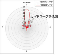 富士通によると、「従来、多数のユーザーが同時に通信すると互いの電波が干渉するため時間や周波数を分割して使う必要があり、通信速度が低下するという課題がありました。」とのことです。そこで同社は今回、60ギガヘルツ(GHz)のミリ波帯において、複数のアンテナ素子を並べたアレーアンテナによるビーム形成時に発生する目的方向外の電波を従来の5分の1に低減する技術を開発しました。 開発技術で細い電波ビームを多重化することで、多数のユーザーが同時に通信を行っても互いに干渉せず通信ができ、大容量通信時の速度低下を最小限に抑えることが可能になります。社内実験では4本のミリ波ビームを形成することで、世界最高レベルである12Gbpsの通信速度を実現することを確認しています。 本技術の詳細は、6月15日(月曜日)に行われる「電子情報通信学会 短距離無線通信研究会(会場:富士通 川崎工場)」にて発表します。 ○開発の背景 スマートデバイスの普及に伴い、無線データ通信のトラフィック量は1年で2倍弱のペースで増大しており、10年で1,000倍の通信容量になると言われています。2020年頃には2010年比1,000倍となる10Gbpsの通信速度を実現する次世代移動通信システム「5G」の無線通信技術の研究が世界各国ですすめられています。我が国でも様々なアプローチで無線通信の大容量化の研究が進められています。 ユーザーあたりの通信容量を増大させるためには、携帯電話基地局やWi-Fiアクセスポイントがカバーするエリア半径を小さくしてエリアあたりの収容数を減らすことや、ミリ波帯などの広い帯域幅を利用できる周波数帯を使用するなどの方法があります。 ○課題 ミリ波帯では、アンテナサイズを小さくすることができるため、アンテナ素子の数を増やすことで空間を小さく分割し、スモールセル方向に照射することが見込まれます。しかし、従来の設計手法によるアレーアンテナでは、ビーム形成時に、目的方向の電波(メインローブ)とは別の方向の電波(サイドローブ)が発生してしまうため、ユーザー多重化のために複数のアレーアンテナを設置するとビーム間で干渉が起き、多数のアレーアンテナを並べることが困難でした。 ○開発した技術 60GHz帯のミリ波を用いて、低サイドローブの細い電波ビームで64パッチのアレーアンテナを試作しました(図2、図3)。通常の電力密度が一定のアレーアンテナではメインローブとサイドローブの電力比は13dB程度ですが、アンテナ給電回路を工夫し、中心付近のアンテナ素子は電力を大きくして、周辺に行くに従い電力を小さくする配分で、従来から7dB(従来比約5分の1)改善した電力比約20dBの低サイドローブを実現しました。 開発技術により、少しずつ異なる方向を向けた複数のアレーアンテナを配置することで、複数ユーザーが同時に通信しても互いに干渉しないようにすることが可能です。 ○効果 60GHzの周波数において1.2GHzの帯域幅で1ユーザーあたり3Gbpsの通信容量を実現する無線機を試作し、4ユーザーで互いに干渉せず、世界最高レベルである12Gbpsの通信容量を実現しました。 開発技術を用いることで、多数のユーザーが密集した場所で同時に通信しても、ユーザーあたりの通信速度低下を最小限に抑えることができ、高速で快適な通信を行うことが可能になります。高画質の動画視聴や、撮影動画をクラウドにアップロードする場合などでも快適な、通信環境を提供できます。 ○今後 富士通研究所は、ミリ波無線機のさらなる高速化とビットレートあたりの低消費電力化を進め、2020年頃の実用化を目指します。