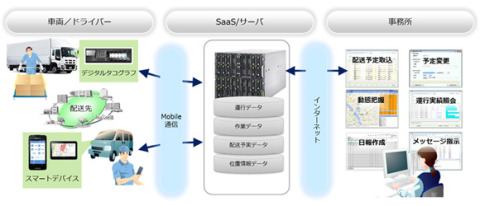 「Logifit TM-NexTR」は、運行車両の分析や運行業務の支援を行うソリューションです。今回、大型車両ではデジタルタコグラフを活用し、中小型車両やデジタルタコグラフを取り付けにくい傭車にはスマートデバイス(スマートフォン、タブレット)を活用するなど、デバイスの混在運用を可能としているそうです。また、車両状態のセンシング情報(速度、燃費、温度など)を収集する機能や、ドライバーのバイタル情報を収集し眠気を予兆段階から検知する機能と連携できるため、現場環境の見える化を実現したそうです。 これにより、専用の車載機などが不要なため運用コストの大幅な削減につながるほか、安全かつ品質の高い輸配送業務を行うことが可能であるとしています。 デジタルタコグラフとスマートデバイスの混在運用を実現しています。車両のセンシング情報、ドライバーのバイタル情報の収集による安全運行のサポートを実現しています。配車支援システムとの連携により、正確で効率的な納品管理を実現しています。