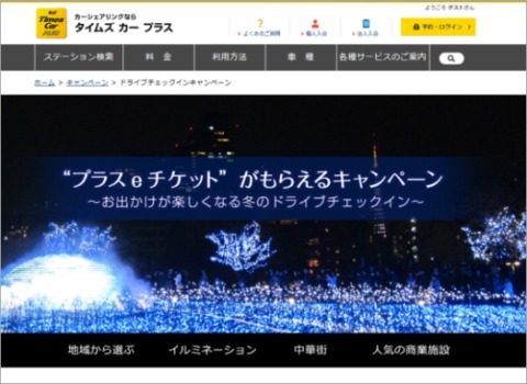 2015年4月1日にスタートした「ドライブチェックイン」は、 タイムズカープラスを利用して対象施設を訪れ、 一定時間駐車すると、 タイムズカープラスで利用できる電子優待券「プラスeチケット」がプレゼントされるサービスです。 そしてこの度、 2015年11月4日(水)〜2016年1月31日(日)の期間限定で、 冬の風物詩である全国の「イルミネーション」と身体の中から温まる料理が楽しめる「日本三大中華街」がドライブチェックインの対象施設となります。 【期間限定の対象施設】 対象施設の詳細はこちらからご確認ください。 http://plus.timescar.jp/campaign/drive_checkin201511/