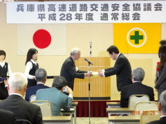 総会に先立って感謝状の贈呈があり、交通安全活動優良事業として松本運送(株)(松本賢吾社長)、(株)神戸急配社(内山克己代表)、兵庫中央バス(株)(宇高昌利社長)、(株)酒井自動車(酒井悦夫社長)ら6社、交通安全功労者として武田聡子氏(スバル興業(株)関西支社)、河野美佐子((株)NEO DAISEI)、衣笠将也(高速道路交通警察隊)、長谷隆司(高速道路交通警察隊)ら7氏に贈られた。 滝川会長は「高速道路の県下の死者は12名と平成26年度比で1名減少した。県下の交通事故で亡くなった方は171名で、これも平成26年度比で11名減少である。関係各機関の皆様が、『安心で安全なハイウェイの実現』に向けて諸対策を推進された結果である。交通事故の死亡事故の特徴は、速度超過や前方不注意、不適切なハンドル操作によるものが大半を占めている。二輪車の死亡事故も4名と多い。また、逆送事故や高速バスによる事故も多発している。交通事故は、『安全と危険が背中合わせ』となっているところに対策の難しさがある。当協会では安全意識の醸成と事故誘発要因の排除に努め、粘り強く効果的な安全活動を推進していく」と挨拶、支援・協力をもとめた。 来賓に大塚啓次・兵庫陸運部長、角田正文・兵庫県警高速道路交通警察隊長らが祝辞を述べた。また役員改選で監事の森川武夫氏が退任、後任に櫻井光男氏(兵ト協副会長)を就任した。