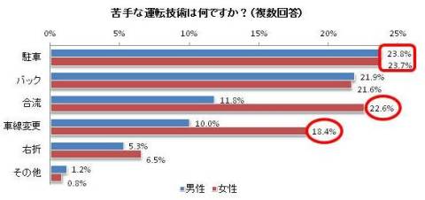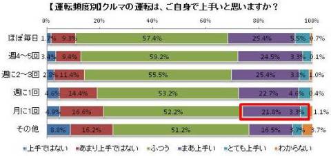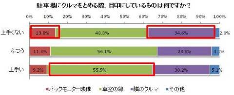 パーク24は、毎月9日に、 クルマ生活に関するアンケートの調査結果を発表しています。 今月の「運転テクニック」に関するアンケート結果詳細は以下の通りでした。 1. 約3割が自身の運転を「上手い」と評価 約半数の方は自身の運転を「ふつう」と回答した一方で、29%の方が「上手い」(「とても上手い」「まあ上手い」)と考えていることがわかりました。 男性は、自身の運転を上手いと考えている方が多いようです。 また、 クルマの利用頻度別に、自身の運転についての評価を調べると、 比較的運転回数の少ない「月に1回程度」の方でも25%が「とても上手い」「まあ上手い」と回答しています。 2. 苦手な運転技術は「駐車」と「バック」。女性は「合流」「車線変更」にも苦手意識 運転が「上手ではない」「あまり上手ではない」と答えた方に「苦手な運転技術」を聞いたところ、 男女ともに「駐車」が最も苦手という結果になりました。次いで、「バック」が苦手な方が多くなっています。また男女別では、女性で「合流」や「車線変更」を苦手としている方が多くみられました。 3. 自分の運転が上手いと考えている方は「車室の線」を目印に駐車 難しいと感じている方が多い「駐車」ですが、 みなさんは駐車の際に何を目印にしていますか?自身で運転を上手いと考えている方(とても上手い、 まあ上手い)は、 上手くない(上手ではない、 あまり上手ではない)と考えている方と比較し、「車室の線」を目印にして駐車している方が多いという結果になりました。 一方、上手くないと考えている方は、「バックモニター映像」や「隣のクルマ」を目印にして駐車をしている人が多い傾向にあることがわかりました。 昨今「バックモニター映像」などの運転支援技術が発達していますが、 運転が上手いと考えている方はそういった技術にあまり頼らずに駐車しているようです。 今回の調査では、「駐車」と「バック」を苦手に感じている方が多いことがわかりました。 このことから、「バックでの駐車」を不得意と感じている方が多いことが想定されます。 パーク24グループでは、教習車両を利用し、「駐車」講習を中心とした「タイムズレッスン」をタイムズ駐車場で随時開催しています。 ちょっとしたコツを掴むことで、 駐車に対する苦手意識がなくなる方も多いようです。 初心者の方はもちろん、 運転に慣れている方も一度タイムズレッスンを体験してみてはいかがでしょうか。 <調査概要> ・調査対象:タイムズクラブ会員 (2014年12月7日以降に入会し、 直近でタイムズ駐車場・タイムズカープラス・タイムズカーレンタルを利用した方) ・調査方法:非公開型インターネットアンケート ・調査期間:2015年12月7日〜12月13日有効回答者数:8,021名