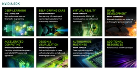 この3つの新機能――NVIDIA DIGITS 4、CUDAディープ・ニューラル・ネットワーク・ライブラリ(cuDNN)5.1、および新しいGPU推論エンジン(GIE)――は、NVIDIAのプラットフォーム上でのソリューション開発を、より容易にする強力なツールとなります。 NVIDIA DIGITS 4では、新しいオブジェクト認識ワークフローが導入されています。データ科学者は、多数の画像の中から顔、歩行者、交通標識、車両などのオブジェクトを検出するようディープ・ニューラル・ネットワークをトレーニングできます。このワークフローにより、衛星画像、防犯・監視、先進運転支援システム、医療診断スクリーニングなど、最先端のディープラーニング・ソリューションが実現します。ディープ・ニューラル・ネットワークをトレーニングする場合、研究者はトレーニング済みのモデルから高い精度を得るため、さまざまなパラメータを何度もチューニングする必要があります。DIGITS 4では、幅広いチューニング・パラメータでニューラル・ネットワークを自動的にトレーニングできるので、最も精度の高いソリューションを導き出すための時間を大幅に短縮できます。 NVIDIA cuDNNは、あらゆる主要ディープラーニング・フレームワークで利用されているディープラーニングに適した、パフォーマンスの高い構成要素を提供します。Version 5.1は、オックスフォード大学のVGGやMicrosoftのResNet(ImageNetの2016年大会で優勝)といった、ディープ・ニューラル・ネットワークのトレーニングを加速します。cuDNNでは、新バージョンがリリースされるたびに前回のバージョンに対するパフォーマンスの向上が行われ、ディープ・ニューラル・ネットワークと機械学習アルゴリズムにおける最新の進歩を加速してきました。 GPU推論エンジン(GIE)は、運用環境向けのパフォーマンスの高いディープラーニング推論ソリューションです。GIEは、トレーニング済みのディープ・ニューラル・ネットワークを最適化して、効率的なランタイムのパフォーマンスを実現します。これにより、現在推論によく使われているCPUのみのシステムと比べ、NVIDIA Tesla M4 GPUで1ワットあたり最大16倍のパフォーマンス向上が得られます。推論タスクを完了するための時間と消費電力は、展開されるディープラーニング・アプリケーションにとって、最も重要な考慮事項の2つです。この2点により、ユーザ・エクスペリエンスの質と、アプリケーションの展開コストの両方が決まります。GIEを使用すると、クラウド・サービス・プロバイダは、高スループットのハイパースケール・データセンター運用環境で、画像やビデオなどのデータをより効率的に処理できるようになります。自動車メーカーや組み込みソリューションのプロバイダは、パフォーマンスの高い強力なニューラル・ネットワーク・モデルを低電力プラットフォームに展開できます。NVIDIA GIEのWebサイトで詳細をご覧ください。 NVIDIAのディープラーニング・プラットフォームは、広範なNVIDIA SDKの一部であり、現代の計算処理において最も重要なテクノロジ(人工知能、バーチャル・リアリティ、並列計算)を1つのプログラムに統合します。これらのソフトウェア・ライブラリ、API、およびツールは、最も人気の高いゲーム・エンジンや、何百ものゲーム・タイトル、GPUアクセラレーテッド・アプリケーションで使用されており、Amazon AWS、IBM Softlayer、Microsoft Azureといったクラウド・プラットフォーム上、そして米国や世界中の最も強力なスーパーコンピュータ上で実行されているアプリケーションやサービスにハイパフォーマンスを提供しています。
