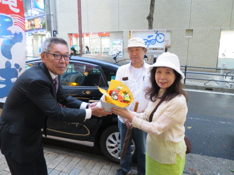 夜景観光と神戸ビーフを食するツアーの第一号利用者に花束贈呈