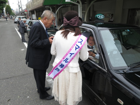 当日キャンペーンに出動したのは、スマイル神戸(親善大使)、兵庫県タクシー協会の吉川紀興会長、地倉道人・神戸個人タクシー理事らで、各乗り場で「笑顔で気持ち良いご挨拶を」と乗務員に呼びかけた。