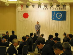 村上支部長は「昨年はわれわれの大先輩の坂尾さんが叙勲の栄に輝かれた。心からお喜びを申し上げたい。さて、われわれの業界は、今年はどのような年になるのか先行きが見えないが、深刻な人手不足にある。3月から準中型免許制が始まる。高卒者に道が開かれたことに期待するとともに、受け入れ体制にも取り組みたい。また当支部では2月にメンタルヘルスケアの研修会を予定しており、参加をお願いしたい。支部会員一丸となって運営に当たりたい。理解と協力をお願いして年頭のあいさつとします」と述べた。 来賓を代表して太田啓三・兵ト協専務理事が当面の課題と助成制度を説明して祝辞とした。 原岡謙一・兵ト協副会長の乾杯発声で開宴となった。