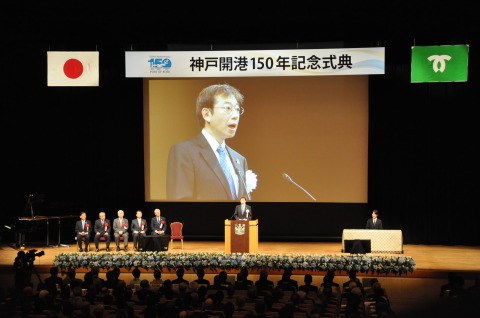 開会にあたり、久本喜造・神戸市長(実行委員会会長)は「神戸は1868年1月1日に港を開き、港と共に発展してきました。開港100年からの50年はコンテナ化への対応、海上文化都市の構想、阪神淡路大震災からの復興など変化の激しい時代でした。開港150年という大きな節目を迎え、神戸港将来構想は世界の中で輝き続ける将来像を打ち出すものであります。神戸のこれまでの歴史を大切しながら、創造的な市民性を受け継ぎ、積極果敢に世界に挑戦する年にしていきたいと思います」と挨拶。 式典には秋篠宮文仁親王殿下が出席され「開港150年を契機として、阪神淡路大震災を乗り越えた神戸港が、我が国の経済発展や国際交流において、より一層重要な役割を果たしていくことを切に願います」とのお言葉があった。 来賓挨拶で久保昌三・一般社団法人日本港運協会会長は「港湾都市神戸の持続的な発展に向けて、日本港運協会も全力でお手伝いさせて頂きたい」と、またビデオメッセージで石井啓一・国土交通大臣は「神戸港が次の150年に向けた新たな一歩を踏み出し、アジアのハブ港、世界のハブ港として大きく飛躍することを祈念します」と、それぞれ祝辞があった。 神戸港将来構想は岡口憲義・神戸市副市長が発表した。 内容は『港湾・産業』と『にぎわい・都市』の2つの目標を掲げ、『港湾・産業』では、神戸国際ロジスティクスパークの構想とし、1.神戸港ロジスティクスターミナル整備による高付加価値化機能を備えた再輸出型トランシップ拠点の形成、2.最先端の技術と高品質な物流サービスによる神戸ブランドの確立 - によって、グローバルなサプライチェーンの中で、新たな価値を生み出す港を目指す。 また『にぎわい・都市』の目標では、世界を魅了するウォーターフロント構想とし、1.世界から人を惹きつける神戸ウォーターフロントの形成、2.クルーズ船受け入れ環境充実とマーケット拡大によるクルーズ都市の構築 – を進めることにより、ラグジュアリーな時・場・出会いで、新たな価値を生み出す港にしたいとするもの。
