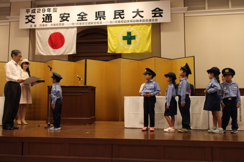 主催者挨拶のあと、知事感謝贈呈式が行われた。兵庫県副知事から個人56名、関西ペイント株式会社尼崎事業所、阪急バス株式会社宝塚営業所、高砂通運株式会社、など28団体へ交通安全の感謝状を贈呈した。キッズ交通保安官任命式では、飲酒運転撲滅のために任命されたキッズ交通保安官5752名の代表として神戸市立こうべ小学校から6名の小学生が壇上へ上がった。大きな声で飲酒運転追放を呼び掛け、会場を沸かせた。 その後、交通安全教室、交通安全ミニコンサートが行われた。木下紘一・一般社団法人兵庫県自家用自動車協会連合会会長による主催者謝辞の後、大会は閉会した。