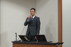 次に、兵庫県警本部交通部交通企画課巡査部長 明谷優輝氏がスライドとドライブレコーダーの映像で「最近の道路交通の現状について」の講演を行った。明谷氏は、「死亡事故の一番多い原因は安全運転義務違反を伴う事故。少しの注意で防げる事故がたくさんある」と説明し、「路線バスは車内単独の車内事故が多い。発進時と停留時は死角に注意をする必要がある」と呼びかけた。また、スピードや距離感の錯覚や錯視が事故につながることから、ミスが発生しても事故になりにくい環境を作ること、ミスの発生回数を減らすことが大切だと述べた。