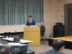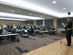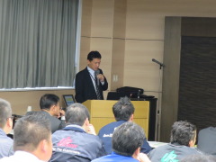 講演は「交通事故防止に係る最近の運輸行政の動きについて」と題して福永清治・兵庫陸運部整備部門専門官が、「県下の交通情勢について」と題して野上浩二・兵庫県警交通部交通企画課警部が講演した。 続いて「我が社の交通事故防止の取り組みについて」と題して松本賢吾社長が講演した。松本氏は「デジタコ、GPS、ドラレコ、IT点呼機器、バックモニター等の活用を述べて、「事故は絶対に起きる」の考えで対処する、要は機器を活用して初めて導入の意味がある。ドラレコ導入(インカメラ)して、ドライバーの意識が変わった。またグループ単位の教育も効果がある。さらに無事故ドライバーの報酬制度も必要でモチベーションが維持できる。要は無事故の取り組みは社長があきらめると社員もあきらめる」と締めくくった。