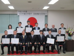 坂野局長の式辞のあと、来賓として出席した福永征秀・近ト協副会長は「利用者が安全性の高いトラック事業者を選ぶ他、業界の安全推進、信頼の増大につながる」と受賞者を称えた。 受賞者を代表して、第一運輸作業の磯野功裕社長が「これを励みにさらに精進します」と謝辞を述べた。 今回の局長表彰は3回目で、管内各陸運支局長(部長)表彰受賞者から選ばれている。 なお、受賞者は以下のとおり。(営は営業所) <大阪>丸一運輸(株)南港営、上田運輸(株)本社営、佃運輸(株)本社営、大阪石油工運(株)本社営、大洋輸送(株)本社営、(株)マツダ運輸大阪本社営、関西海運(株)本社営、(株)樋口物流サービス本社営、(株)山中運輸本社営、大阪三興物流(株)東大阪営、新三興物流(株)吹田営、一宮運輸(株)大阪営 <京都>日通京都運輸(株)本社営、京都三興物流(株)本社 <兵庫>愛知車輛興業(株)大阪営、ケイヒン陸運(株)本社営、酸和運送(株)兵庫営、(株)三和総業本社営、(株)シキトウサービス本社営、第一運輸作業(株)本社営、台神商運(株)本社営、(株)太陽コーポレーション姫路本社営、龍野運送(株)龍野営、都宝産業(株)滝野営、和光運輸(株)本社営 <奈良>奈良郵便輸送(株)奈良営、奈良郵便輸送(株)中和営、奈相流通(株)本社営、ジェイ・ネット(株)本社営、日通奈良運輸(株)橿原営 <滋賀>(株)サカイ引越センターびわこ支社、センコー(株)湖東車輛センター