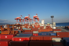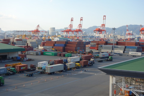 はじめに、コンテナバースの管理を行う商船港運株式会社(以下、商船港運)により主要な航路や、ガントリークレーンや完全自動化されたターミナルゲートなどの導入設備の説明が行われた。商船港運・神戸事業部・業務グループ・グループリーダー中村氏によると、2001年に導入されたこの自動化ゲート(写真右上)は、「従来よりも効率化が実現」され、スタッフ一人で複数レーンを対応できるようになり、荷降ろし待ちを原因とするターミナル周辺の渋滞緩和に寄与しているとのことだ。 次に、前述の交通艇「はるかぜ」による海からの見学では、コンテナターミナルのほか、神戸港湾の工業地域が見えるルートを通過し、昨今の神戸港の状況についての説明がなされた。普段は見ることのできない海からの視点で眺望することで、国際貿易港の拠点としての神戸港と、国内の一大工業地域としての神戸港の両面を窺い知ることができた。