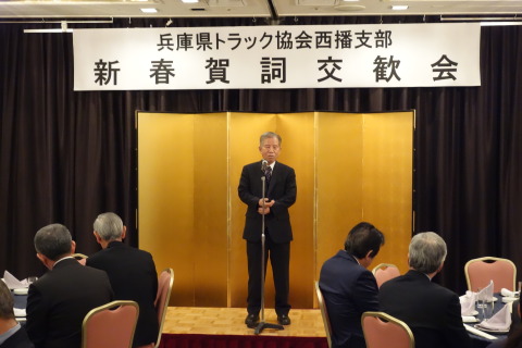 兵庫県トラック協会西播支部(濱田長伸支部長)は、1月12日ホテル日航姫路で新年親睦会を開催した。支部長、副支部長、役員らに加え、来賓に福永征秀兵庫県トラック協会会長らを迎え、約30 名が出席した。