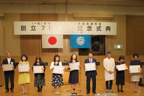 来賓祝辞で坂野局長は「交通事故対策からも車の先進技術の開発、普及と環境負荷の低減を図ってまいりたい。貴連合会のさらなる発展を祈る」と、また松元部長は「超高齢化社会に向けた、交通安全思想の普及、高揚に尽力ください」と述べた。 このあと、会員感謝状贈呈があり、功労地区協会会長には武内重治・伊丹協会長ら7人に、功労地区協会事務局責任者として木場未𠮷氏(神戸中央)ら8人に、永年在勤地区協会職員として片岡春輝氏(<一社>灘)ら21人に木下会長から贈られた。 閉式のことばで武内重治副会長は「歴史ある当連合会ですが、今後とも地域社会に貢献して80年、100年と年輪を増やして活躍してまいりたい」と締めた。 祝賀会は渡邊秀行常務理事の開宴あいさつに続き、宮浦栄太郎理事の乾杯発声で祝宴となり、和やかな歓談が続いたのち、中村仁志専務理事の閉宴のあいさつで手締めとなった。