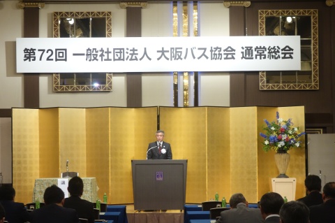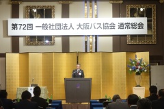 来賓祝辞で坂野公治・近畿運輸局長は、近畿貸切バス適正化センター設立に際しての井波前会長の尽力に謝辞を述べ、「桝元新会長にも引き続き大阪のバス業界をけん引していただきたい」と期待を寄せた。「運転者不足は依然深刻な状況で、新たな需要を生み出す新規路線や新規分野への進出は進まず、減便・路線廃止といった事案も相次いでいる。そんな厳しい環境の中、各自治体では地域公共交通活性化再生法にもとづいて、まちづくりと一体となった公共交通の再構築に着手している。各事業者も自治体と積極的に対話を行い、連携と協調を図っていただきたい」と求めた。続いて、綿貫直・大阪労働局労働基準部監督課長、馬場正俊・大阪府商工労働部中小企業支援室経営支援課長(大阪府知事の祝辞代読)、竹内広行・大阪府警察本部交通部交通総務課長らが祝辞を述べた。