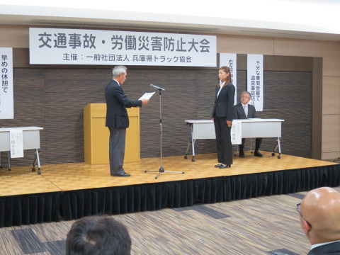 福永会長は冒頭挨拶で「年末・年始の繁忙期に向けて安全最優先を目指した大会です。さらなる事故と災害防止に取り組んでいただきたい」と呼びかけた。 大会のはじめに、今年の全国トラックドライバーコンテスト女性部門で優勝した田渕由子さん((株)日立物流西日本兵庫営業所)に福永会長から表彰状が送られた。また、来賓祝辞で成久博康・兵庫陸運部長は「運行管理制度の徹底、監査の強化、安全マネジメントの活用を三位一体として他機関と連携して安全施策を展開してまいる所存です」と安全確保の協力を強く求めた。 講演は野上浩二・兵庫県警交通部交通企画課警部が「県下の交通事故情勢について」述べて、「状態別事故では歩行者、自転車が1位、2位。乗車中死者48人中20名はシートベルト非着用。とくに歩行者妨害は交通違反で取り締まりも強化している」と注意を喚起した。 >>2ページ目へ続く