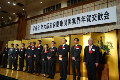 桝元会長は「昨年は米国発の貿易摩擦や、中国景気の減速など海外リスクが膨らみ、国内景気の回復局面に大きな不安を残した。国内では度重なる自然災害が発生し、広い地域で大きな被害をもたらした。関西では関西国際空港が被災し、一時は訪日外国人旅行者が大幅に減少した。しかし、その後は、国土交通省と運輸局の対応により、早期の復旧がかない、関西への訪日外国人旅行者数が昨年を上回るほどに回復し、安堵した」と昨年を振り返った。また、自動車税制改正について触れ、「昨年12月14日に取りまとめられた『平成31年度税制改正大綱』において、自動車の保有にかかる税負担を恒久的に引き下げるという事が実現した」と報告。今年の抱負として、「今年は亥年、新たな生命が宿る年と考えられており、猪といえば『猪突猛進』。大阪自動車会議所は本年も皆様方と緊密な連携を図りながら、自動車関係業界が共通して抱える課題に結束して取り組み、人と環境に優しい車社会を生み出すよう、邁進していきたい」と述べた。 >>2ページ目へ続く