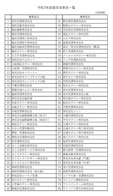 大阪タクシーセンター(西岡信也会長)はこのほど、大阪府下のタクシー事業者から申請の「優良事業者等評価制度」について審査、別表の80社を認定した。