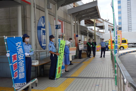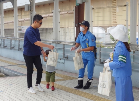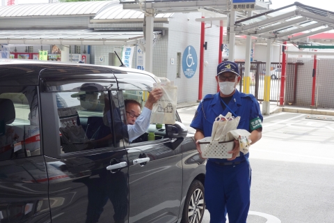 兵庫県警察 高速道路交通警察隊・神戸水上警察署・兵庫県高速道路交通安全協議会・阪神高速道路(株)・阪神高速パトロール(株)は9月23日、京橋PAで秋の全国交通安全運動キャンペーンを行った。キャンぺーンは、京橋PAの利用者に『あおり運転』の防止やシートベルト着用などを訴えて、計80個のグッズを配布した。 活動開始の冒頭、河本博幸・兵庫県警察 高速道路交通警察隊長は「全国交通安全運動も始まり、交通量も増え、渋滞も発生している。この機会に交通安全の啓発活動をして、心に伝わるようなキャンペーンになればと思う。また、阪神高速道路さんに『あおり運転の禁止ステッカー』を作っていただきました。それを有効に活用して事故抑止に努めてまいりたい」とあいさつした。 秋の交通事故防止運動は9月21日から30日まで実施、兵庫県下の高速道路でのキャンペーンは、京橋PA、明石、龍野、三木、山崎(IC)、豊富、西紀、淡路のSAで行われる。