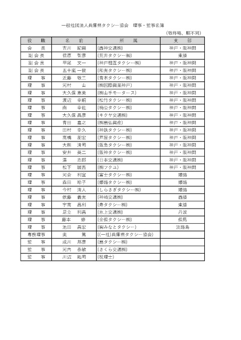 理事数は25名に縮小して選任する 兵庫県タクシー協会(吉川紀興会長)は10月28日、神戸市中央区の生田神社会館で10月臨時総会を開き、理事定数を20名以上30名以内とする一部定款の改正を決定、任期満了となった役員の改選で、各支部推薦の理事25名と監事2名を承認した。新理事による臨時理事会で信原智彦理事の発議による吉川会長再選案を決定、副会長の信原智彦、平尾文一、五十嵐一俊3氏の再選、奥篤専務理事、川辺拓司監事の選任も決めた。 吉川会長は、過去2年間の歩みを顧みて、「運賃改定の効果もあってコロナ禍でも、運収を維持できた。また自治体への働きかけで助成も受けた。この2年間はこのメンバーでやっていく。理事会は毎月1回開き、情報を汲み上げ、伝達も速やかにする」と意気込みを見せた。 臨時総会に続き、兵庫県タクシー防犯協力会を開き、会長以下全役員は兵タ協役員と決定。 兵庫県タクシー事業政治連盟総会も開催、会長に信原智彦会長を再選、役員は兵タ協役員を充当した。 新役員は別表のとおり(順不同、敬称略) (株)兵庫県タクシー会館の平尾文一・代表取締役は兵タ協臨時総会で、会館の土地処分等の近況に触れて「会館の土地を売却して、新しい建物に協会が賃借する提案が持ち上がっている。前向きに検討したい」と報告した。これは現在の土地が兵庫県の再開発構想の場所とあって、県と協議することとなっているもの。 平尾氏は、その後に経緯として「積水ハウス、阪急不動産から計画案が持ってきている。新しい建物の一部を協会に貸すと言うもの。家賃も今と変わらないという」とした。 兵庫県は、兵庫県庁の建て替えをはじめ会館と隣接する総合庁舎を含む地域の再整備に入るもので、積水、阪急とも具体案を県ととも会館側に提示することになる。計画決定は数年先、完成は約10年と言われるが、阪神淡路大震災で半壊認定の会館であることから、移転も具体化しそうだ。
