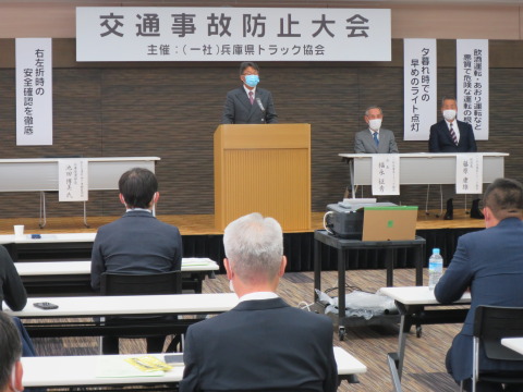兵庫県トラック協会(福永征秀会長)は12月4日、兵ト協会館で令和2年度交通事故防止大会を開き、(1)追突事故、過労運転、車間距離確保、制限速度遵守 (2)右左折時の安全確認 (3)夕暮れ時の早めのライト点灯、雨天曇天時の点灯 (4)信号のない横断歩道で歩行者、自転車が渡りきるまで停止 (5)飲酒運転、あおり運転など危険運転の根絶―の5項目の重点目標を実践する大会決議を採択して無事故を誓った。 福永会長は開会にあたり「年末年始の無事故を願って毎年この時期に大会を開き、事故防止に努めている。すでに20件の飲酒事故も発生しており、社会的信頼を失墜させかねる状況です。管理者もドライバーも心に余裕を持って業務に努め、この大会が実りあるものとなるよう祈念します」と挨拶。 来賓の池田博美・兵庫陸運部長は「コロナ禍におけるエッセンシャルワーカーとしての物流事業者には心から敬意を表します。今年は総合安全プラン2020の締めの年ですが、目標達成は難しい状況にあります。事故防止は社会との共生のためからも最重要課題です。行政も運行管理の徹底、監査強化、安マネの推進の三位一体で取り組んで参りたい」と述べた。 >>2ページ目へ続く
