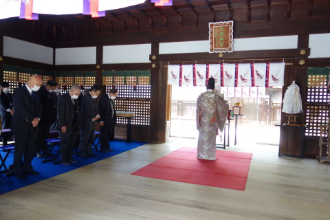祈願祭では神職による祝詞が奏上され、全員に金鈴授与があった。続いて笹山理事長、稲田豊副理事長、大亀保彦副理事長、原岡謙一副理事長、奥野澄夫業務委員長、中川道明事故防止委員長が玉串を奉納し、一拝して祈願を終えた。