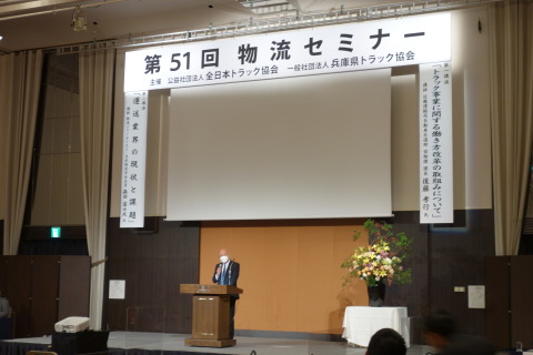 兵庫県トラック協会(原岡謙一会長)は11月2日、ANAクラウンプラザホテル神戸で第51回物流セミナーを全ト協共催で開催した。 開会で原岡会長は「新型コロナウイルスの影響で、物流業界も貨物の減少が顕著になっている。また、少子高齢化によるドライバー不足、労働時間が他の仕事に比べ長時間であり、低賃金だ。現状のままで、必要なドライバー数を確保することが難しい。これにより経済活動に支障をきたすことになりかねない」と業界の現状について述べ、また「コロナによる経済の冷え込みにより、荷主の理解を得にくい状況。ドライバーの労働状況の改善に必要な、待ち時間の短縮や運送契約の書面化、よりトラック業界の働き方改革の実現に向けてご理解とご協力を賜りますようお願いします」と挨拶した。 来賓の池田博美・兵庫陸運部長は「標準的な運賃の告示は、荷主企業様の協力が不可欠。当局は事業者のみなさまが荷主と交渉しやすいよう、標準的な運賃の告示制度の趣旨を荷主へ周知していく。荷主には理解、事業者には活用をお願いしたい」と挨拶。続いて岸泰広・兵庫労働局労働基準部長は「2024年4月1日以降、時間外労働の上限規制が年間960時間となる。各事業所のみなさまには上限規制の適用が円滑に進むよう準備をお願いしたい。また、労働災害が増加しており、リスクアセスメントの取り組み継続してほしい」とした。また矢野浩氏・兵庫県警察本部交通部長は「令和3年度9月末の交通事故の死者は、77名(+10)で、高齢者の死者は49名となっており、全体の死者数の63.6%と大きな割合を占めている。全国の交通事故による高齢者の死者数56.6%を大きく上回るという結果だ。またJAFの調査による信号機のない所での歩行者への一時停車は43.0%で昨年より14.1%下げることができたが、全国平均よりも高い状況。本県警では、目で合図のアイコンタクト運動を展開。実行の協力をお願いします」とした。 講演は、後藤孝行・近運局自交部貨物課長が「トラック事業に関する働き方改革の取り組みについて」と題して述べた。貨物自動車運送事業法の一部を改正する法律(議員立法)の目的としては、担い手である運転者の不足により重要な社会インフラである物流が滞ってしまうことのないよう、緊急に運転者の労働条件を改善する必要があること等に鑑み、所要の措置を講じるものである。これにより「標準的な運賃の告示制度」が設けられ、2020年4月24日に告示された。この制度は、一般にトラック事業者の荷主に対する交渉力が弱いことや、2024年度から年間960時間の時間外労働の限度時間が設定されること等を踏まえ、運転者の労働条件を改善し、トラック事業者が法令を遵守して持続的に事業を行う際の参考となる運賃を示したものである。この制度は、荷主企業の「標準的な運賃」への理解と協力が必要であるとした。 物流ジャーナリストの森田富士夫氏は「運送業界の現状と課題」と題して講演した。森田氏は2024年問題の対応として、時間外労働の上限規制960時間は一般則ではすでに年720時間になっており240時間の差があるとした。これによりたとえ960時間をクリアしても月に20時間分は50%割増分を払わなければならない。2024年問題とは、労働時間短縮がいかに経営課題として重要かを示した。標準的運賃の実現に向けては、原点を再確認することが必要で、ドライバーの労働条件の改善が主目的である。さらに、標準的運賃は標準運送約款と連動して交渉するのが有効とした。理由としては、標準的運賃だけでは、社内稟議を通すのが難しく交渉の幅が狭くなる。労働時間短縮のための待ち時間の短縮などの協力なら、荷主に対して交渉の幅も広くなるのではないかと解決に向けての考えを示した。