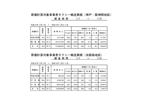 1月度のタクシー輸送実績(神戸・阪神間地区と淡路島地区)