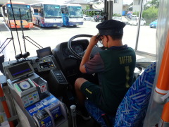 神戸運輸監理部(田淵一浩運監部長)は7月28日、神姫バス株式会社西脇営業所で、西脇市、加東市周辺の自治体の小学生を対象に「交通環境教室」を開催した。当日は、コロナウイルス感染症対策と熱中症予防対策を行い、小学生11人、保護者7名が参加した。 この教室は、次世代の環境問題を担う子どもたちに、バスが「人と環境にやさしい乗り物」であることを理解してもらい、自発的に人や環境にやさしい行動を選択できる人材を育て、バスの乗降体験を通じて公共交通について関心を持ってもらい、利用促進につなげていくことを目的としたものだ。 はじめに神戸運輸監理部交通みらい室より、実際に西脇市内を運行しているバスの車内において、バスが「人と環境にやさしい乗り物」であることについて、紙芝居形式で小学生にもわかりやすい説明があり、続けて神姫バス株式会社の担当者から、ICカードを使った乗車、降車体験、乗車マナー、バス前方の運転手から死角となって見えないところなどの様子を実際に体験した。 また、車内にある手すりについて、高齢者等が車内を移動しやすいように配置されていることや、手すりの位置がわかりやすい「オレンジ色」になっていること、次の停留所で降りることを運転士に知らせる「とまります」のボタンが車内のいたるところにあることなど、バスの設備工夫について、学びを深めた。 さらに、バスのエンジンの見学や車いすを使用している方が乗車時に乗りやすくなるよう、バスを少し傾ける「ニーリング」、運転席での記念撮影など、普段見ることや体験のできない内容となった。 なお、神戸運輸監理部では、今後も「人と環境にやさしい」バスをはじめとした公共交通機関の利用促進につながる取り組みを積極的に行い、交通運輸の分野からの地球温暖化防止を進めていくとした。