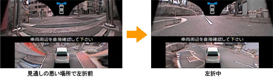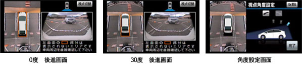 1.立体的俯瞰映像で表示 2.お好みで3段階(0度 15度 30度)の視点角度に切換 ![]() 3.右左折時におけるブラインドコーナーモニターと車両後方視点からの映像を同時表示