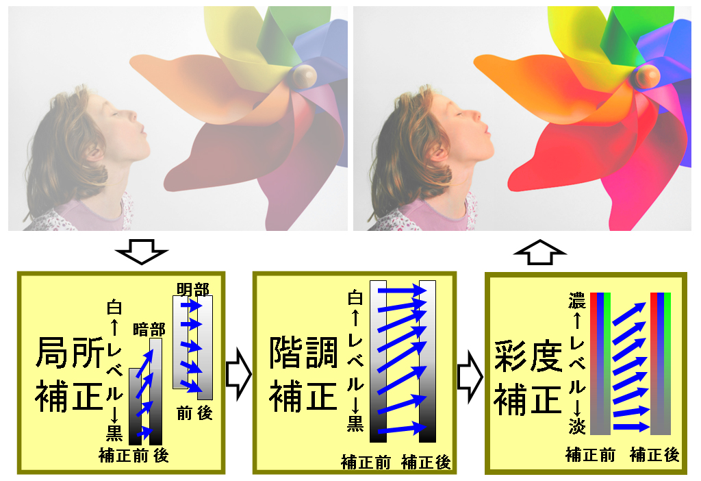入力画像を解析し、画像の場所ごとに階調差をつけて、どのような明るさの領域も明暗差を拡大できるようにする「局所補正」、暗い領域の階調をつぶれが生じにくい明るい階調に移す「階調補正」、色の薄まりを抑制して鮮やかにする「彩度補正」を組み合わせて、見えにくくなる暗部のコントラストおよび彩度を瞬時に自動補正。