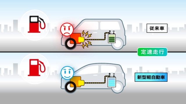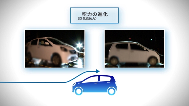 ・安全性や快適な乗り心地に必要なボディ剛性の維持を前提とした、シェルボディの骨格合理化により、全長を短縮することなく約30kgの軽量化*を実現。 (1)骨格部材の配置見直し (2)構成部品を可能な限りストレート化することで補強材を削減する形状最適化 (3)高張力鋼板の効果的な配置 など ・新構造シート骨格の採用や、インストルメントパネル・ドアトリムなどの樹脂部品の薄肉化など、内装部品ひとつひとつの徹底した見直しにより、軽量化を実現。 ・CVTケースの薄肉化や、オイルポンプカバーおよびプラネタリキャリアのアルミ化、セカンダリーセンシングギアとピストンの一体成型化などにより、アイドリングストップ用CVTユニットの軽量化を実現。 * ダイハツ調べ。ミラ〔2WD/CVT(アイドリングストップ機能有り)〕との比較。 ◆走行抵抗の低減 ・トレッドゴムの変更などを行なった低転がり抵抗タイヤの採用に加え、駆動部品の改善などにより、転がり抵抗を低減。 ・デザイン段階から、CAEシミュレーションや風洞実験を実施し、フロントのコーナー形状の改善や床下流速の減速化などにより空気抵抗を低減。 ◆エンジンルーム内の熱マネジメント ・バンパーの開口部やエアクリーナーダクトの最適配置、さらには導風経路を改善することで、エンジンへの吸気温を低減する熱マネジメントを採用。吸気の体積膨張による吸気量の減少を抑えて、エンジンの燃焼効率を向上。 3.エネルギーマネジメント ![]() ◆停車前アイドリングストップ機能付の新「eco−IDLE」