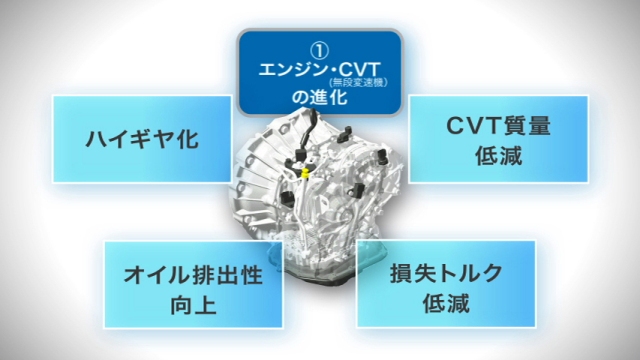 1.パワートレーンの進化 ◆燃焼効率向上とエネルギーロス低減を極めた新エンジン ・圧縮比の向上(10.8→11.3)やインジェクター噴霧微粒化など8項目にわたる改善を積み重ね燃焼効率を向上。 ・燃焼室内のイオンで燃焼状態を検知するイオン電流燃焼制御をEGR制御に応用した、「i−EGRシステム」を採用。エンジン特性に合わせ緻密に制御することで、EGRガスをより大量に送り込み、ポンピングロスを大幅に低減。 ・チェーン幅細化による張力低減や、ピストンリングの低張力化、オイルシールの見直しなど、11項目にわたる改善を積み重ねメカニカルロスを極限まで低減。 ・軽量な樹脂製電子スロットルボディを採用。電子スロットルによるエンジンとCVTの協調制御を、速度域に応じて緻密に制御することにより、CVTがあらゆる変速比であっても最も効率の良い状態に維持。 ◆動力伝達効率をさらに向上したCVT ・高効率オイルポンプの採用や、CVT制御圧の低圧化など8項目にわたる改善を積み重ね、動力伝達効率を向上。 ・動力伝達効率の向上、走行抵抗の低減、車両の軽量化などを踏まえた、変速ギア比の最適化(ハイギア化)により、エンジン負荷を低減。 2.車両の進化 ![]() ◆シェルボディの骨格合理化などにより、約60kgの軽量化*を実現