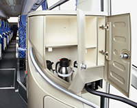 ● 最先端の環境技術「BlueTec®システム」(再生制御式DPF+尿素SCR)と 「6M60型」エンジンの改良により、実用燃費と動力性能が向上 ● 全車でポスト新長期排出ガス規制(平成21年・22年規制)に適合 ● 燃料タンク容量を増やし、航続距離を大幅に延長 ● 新設計のサービスボックスを採用 1. 商品概要 (1) 環境に優しく経済性に優れた最先端の技術を搭載 「BlueTec®システム」(再生制御式DPF+尿素SCR)と燃焼効率を高めたエンジンを組み合わせることにより、高い環境性能と燃費性能を両立し、ポスト新長期排出ガス規制(平成21年・22年規制)に適合しました。 1. 排気後処理装置「BlueTec®システム」によりクリーンな排出ガスを実現 地球環境を保全するため、二律背反の関係にあるPMとNOxの排出量の低減と低燃費を両立させる技術として「BlueTec®システム」(再生制御式DPF+尿素SCR)を新たに採用しました。 このシステムは酸化触媒と耐久性に優れたSiCセラミックフィルターを組み合わせた「再生制御式DPF」で、排出ガスに含まれるPMを捕集、燃焼除去し、残ったNOxをSCR触媒マフラーと尿素水ドージングノズルで構成した「BlueTec®(尿素SCR)」で、尿素水から生成したアンモニアの化学反応によって、無害な窒素と水に分解する最新の排気後処理システムです。 2. 「6M60」型エンジンの改良により動力性能と燃費性能を向上 4弁SOHC直列6気筒インタークーラターボエンジン「6M60」型エンジン(199kW/270PS)を改良したことで、よりフラットなトルクと最大トルクの発生回転域の拡大により、低速からでも力強い走りを実現しました。エンジンの最新技術として、燃料の高圧噴射を可能とし、PM発生を大幅に低減するコモンレール式燃料噴射システムや、低回転から高い過給効果を発揮するVGターボ、そしてNOxの生成を抑える高精度クールドEGR(排気再循環システム)を採用することで、従来車に比べ燃費を向上しました。 大型観光バス「新型エアロエース ショートタイプMM」 (撮影用特別仕様車) (2) 快適性と利便性を追求したインテリア 1. 新設計のサービスボックスを採用 様々な使い勝手に優れたサービスボックスを従来に比べ40ℓ拡大しました。31ℓのボトルクーラーと6ℓのカーポットを一体化し、お客様へのサービスを向上しました。 ![]() 2. 快適な室内空間を実現