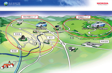 Hondaは、熊本県とニッポンレンタカーサービス株式会社(以下、ニッポンレンタカー)や全日本空輸株式会社(以下、ANA)と共同で、阿蘇くまもと空港を起点とする、阿蘇地区を中心とした熊本県内で、電気自動車(以下、EV)およびプラグインハイブリッド車を使った観光レンタカーの実証実験を、2012年9月より開始します。