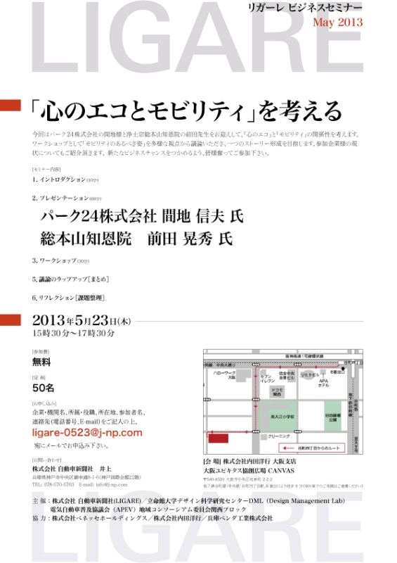 2013年度のテーマは「モビリティのあるべき姿を多様な視点から検討する」とし、既存のハードを一度忘れて、一般消費者にとって本当に必要なモビリティとは何かを従来のクルマ関連の方々やそれ以外の方々との多様な議論によって導きだしたいと考えています。 そこで、今回はパーク24株式会社の間地様と浄土宗総本山知恩院の前田先生をお迎えして、パーク24株式会社のモリビティの取り組み、また総本山知恩院とモビリティの関係をご講演いただきます。 また、ワークショップとして「モビリティのあるべき姿」を多様な視点から議論いただき、一つのストーリー形成を目指します。 今会議では講演後、参加者によるディスカッションなどを通じ、 新しいモビリティの概念の形成やそこに関係する新たなネットワークの構築を目的とします。 是非、ご参加ください。 もちろん今回も会費は【無料】です。 お早めにお申し込みください。 この機会に電気自動車に興味のある方、お知り合いの方も、お誘い下さい!! ■日時:5月23日 15時30分〜17時30分 ※今回は懇親会を企画いたしません。 会議後みなさまでお誘いの上、お楽しみください。 ■場所:株式会社 内田洋行 大阪支店 大阪 ユビキタス協創広場 CANVAS 〒540-8520 大阪市中央区和泉町2-2-2 地下鉄谷町線・中央線「谷町四丁目駅」8番出口より徒歩8分 ※お車でのご来館はご遠慮ください。 ■主催: 立命館大学デザイン科学研究センターDML(Design Management Lab) 株式会社自動車新聞社(LIGARE) 電気自動車普及協議会(APEV)地域コンソーシアム委員会関西ブロック ■後援: 株式会社ベネッセホールディングス 株式会社内田洋行 兵庫ベンダ工業株式会社 ■プログラム 1.イントロダクション 2.プレゼンテーション パーク24株式会社 間地 信夫 氏 3.プレゼンテーション 総本山知恩院 前田 晃秀 氏 4.ワークショップ 5.議論のラップアップ[まとめ] 6.リフレクション[課題整理] ■ご参加ご希望の方は、 【5月20日】までに、メールで下記のフォーマットをお使いいただき kansai-ev130523@dml-ritsumei.jp 宛にお送りください。 *ご参加者お一人につき、一通お申し込みをお願いします **(お申込みフォーム)***************************** 貴社名または貴団体名: ご所属・お役職名: ご参加者名: ご連絡先 Email アドレス : もしくは 直通のお電話番号TEL: ************************************************** お問い合わせ先: 後藤智(ごとう・さとる) rr004001@ed.ritsumei.ac.jp 本会議コーディネーター/立命館大学テクノロジーマネジメント研究科博士後期課程/ 立命館大学経営学部DML(Design Management Lab)事務局/ APEV 地域コンソーシアム部会関西ブロック事務局 |