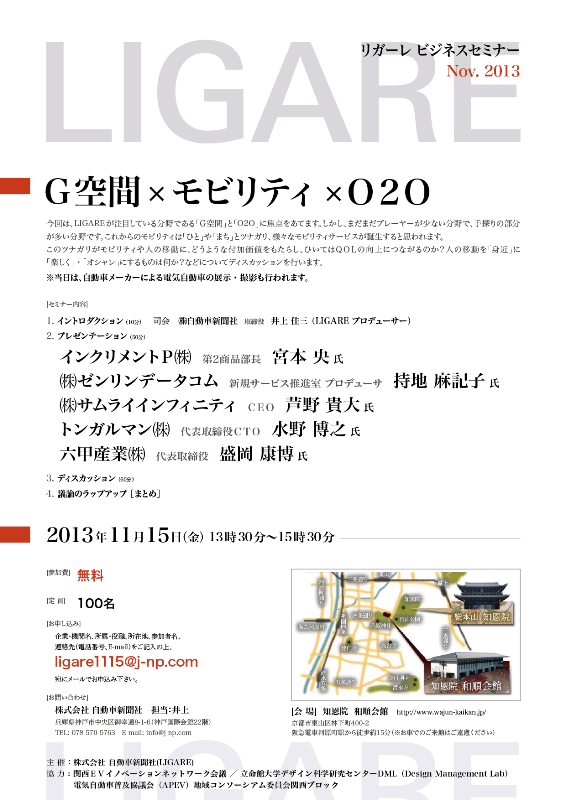 が多い分野です。これからのモビリティは「ひと」や「まち」とツナガリ、様々なモビリティサービスが誕生すると思われます。 このツナガリがモビリティや人の移動に、どうような付加価値をもたらし、ひいてはQOLの向上につながるのか?人の移動を「身近」に 「楽しく」・「オシャレ」にするものは何か?などについてディスカッションを行います。 ※当日は、自動車メーカーによる電気自動車の展示・撮影も行われます。 [セミナー内容] 1. イントロダクション( 10分) 司会 自動車新聞社 取締役 井上 佳三( LIGARE プロデューサー) 2. プレゼンテーション( 50分) インクリメントP 第2商品部長 宮本 央 氏 ゼンリンデータコム 新規サービス推進室 プロデューサ 持地 麻記子 氏 サムライインフィニティ CEO 芦野 貴大 氏 トンガルマン 代表取締役CTO 水野 博之 氏 六甲産業 代表取締役 盛岡 康博 氏 3. ディスカッション( 60分) 4. 議論のラップアップ[ まとめ] 開催日時 2013年11月15日(金) 13時30分〜15時30分 ![]() [会 場] 知恩院 和順会館 http://www.wajun-kaikan.jp/